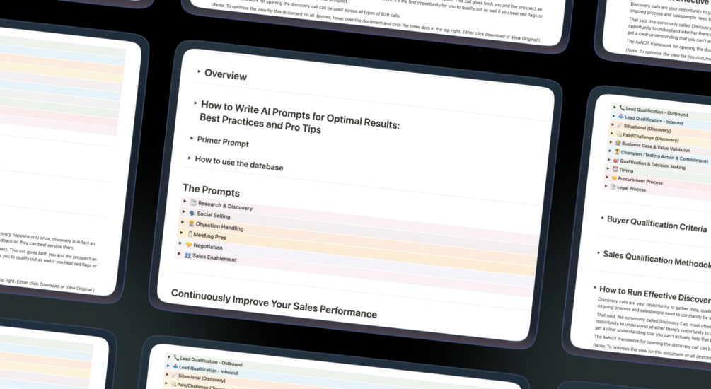 Over 20 sales specific AI prompts designed to accelerate key aspects of a sales process. Each prompt comes with guidance on why it's important to the sales process. It also includes insight into how to use AI for sales in general, how to create prompts and key considerations when using AI.
