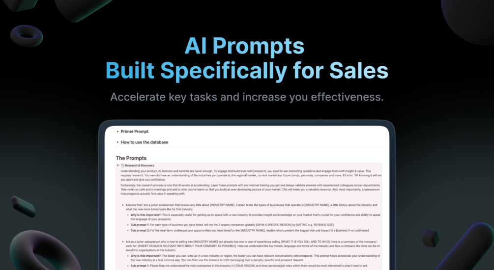 Over 20 sales specific AI prompts designed to accelerate key aspects of a sales process. Each prompt comes with guidance on why it's important to the sales process. It also includes insight into how to use AI for sales in general, how to create prompts and key considerations when using AI.
